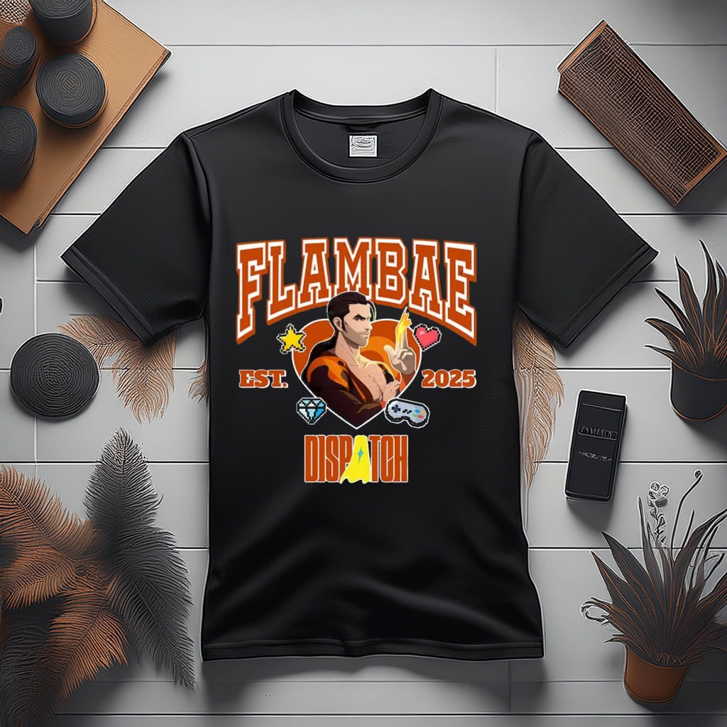 Designed with a modern unisex fit, this shirt pairs effortlessly with jeans, joggers, hoodies, or layered streetwear. It also makes a fun and memorable gift for Dispatch Game fans, Flambae enthusiasts, and anyone who enjoys quirky, character-driven apparel.