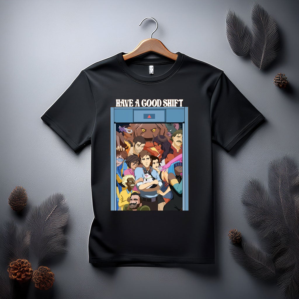 Step into the iconic world of Dispatch with the Have a Good Shift Elevator Crowd Shirt. Featuring a lively illustration of characters in an elevator scene, this tee captures the humor, energy, and unique storytelling of the Dispatch universe. Perfect for fans who love memorable moments, bold artwork, and standout graphic tees.