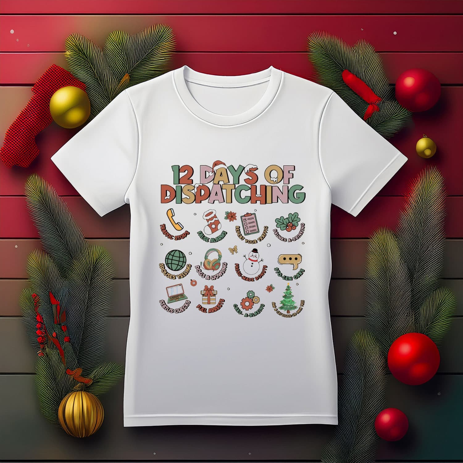 Crisp DTG print: Bright Christmas colors with fun dispatcher-themed graphics