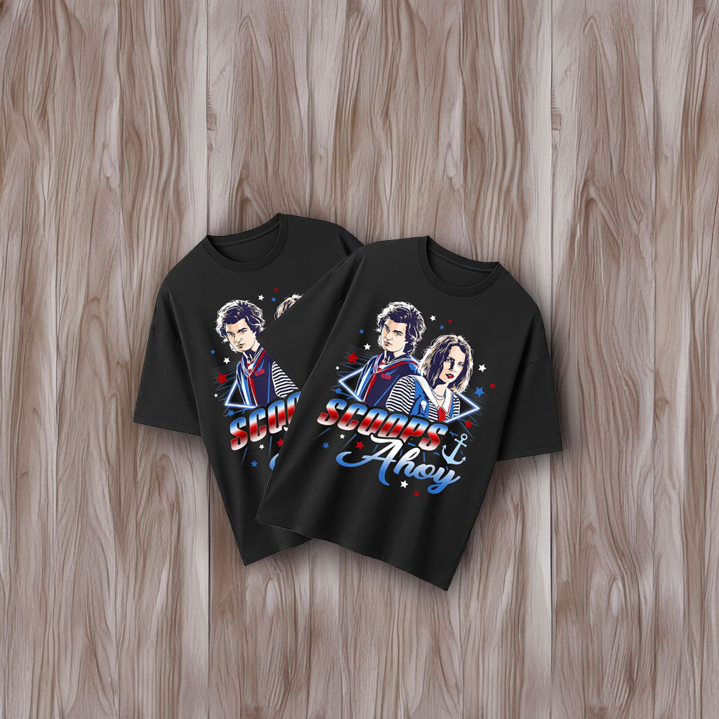 The graphic showcases Steve and Robin’s unforgettable Scoops Ahoy era, complete with retro typography, maritime elements, and a design that looks straight off an old-school mall uniform — but way cooler. Printed on a soft, comfortable unisex tee, it’s perfect for everyday wear, fan events, Comic-Cons, or binge-watching your favorite Stranger Things episodes.